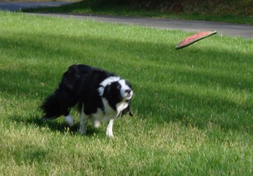 My husband took Luath outside to play frisbee in our front yard, and I took my camera. I had tried to get photos of him playing frisbee before but never had been successful. However, this is the first time I’d used my newer camera, a Sony Cyber-Shot, and its motion stabilization allowed me to get some nice pictures. I’m thrilled. I did not try to push it by using the 3x zoom because I was more likely to get Luath in the frame that way; I simply cropped the photos afterwards. I still managed to get some photos of all grass, though.