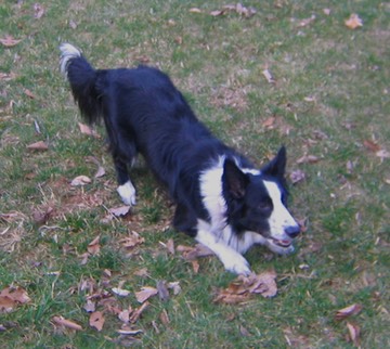 In the picture above, he is waiting for me to throw a frisbee for him. It’s a bit hard to get a good picture of him because he moves so fast! He does know stay, and I have taken some pictures of him in a stay, but they’re not nearly as good as when he is chasing a frisbee. “Luath” means quick in Scots Gaelic and he lives up to the name -- it’s fun to watch him run! I have a new camera now which can sometimes catch him in motion without blurring but it’s hard to take the picture while he’s still where you’re pointing -- and hard to anticipate where he’s going to be!